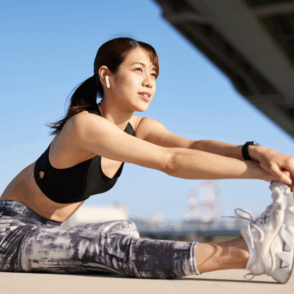 軽いジョギングで心拍数を整えたあと、反動や弾みをつけずにゆっくり筋肉を伸ばすストレッチを行うと効果的です。