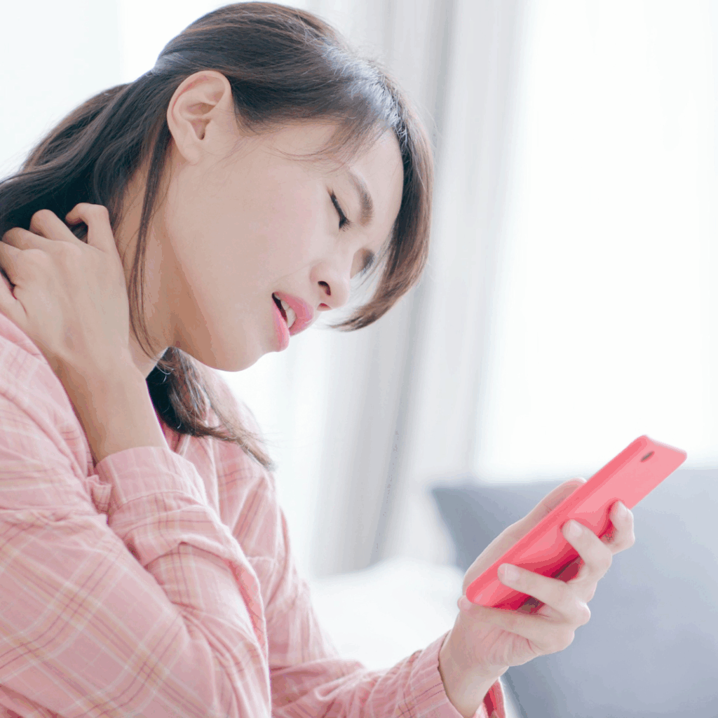 スマホをうつむき姿勢で長時間使うと、首や肩に負担がかかります。