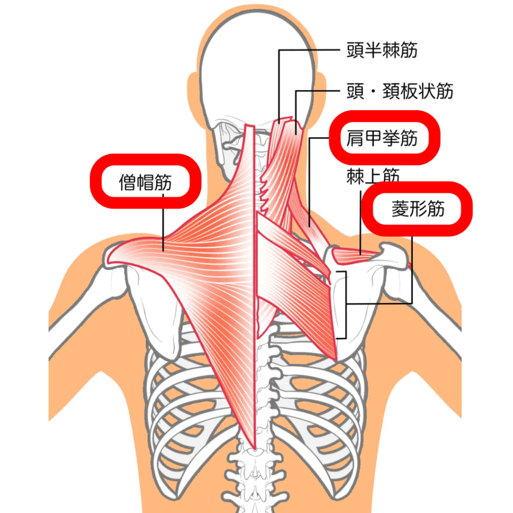 肩こりに関わる主な筋肉は、首から背中に広がる僧帽筋、首と肩甲骨をつなぐ肩甲挙筋(けんこうきょきん)、その深いところにある菱形筋(りょうけいきん)などです。